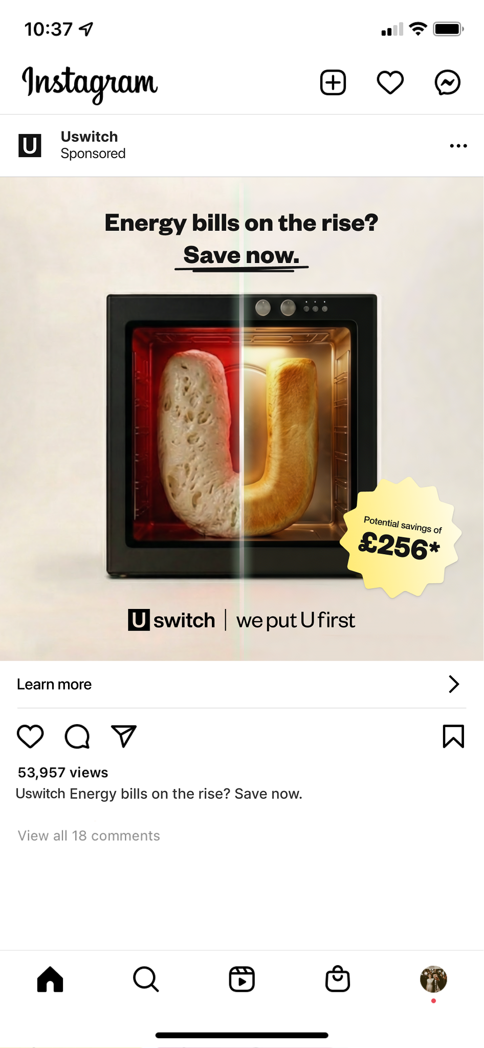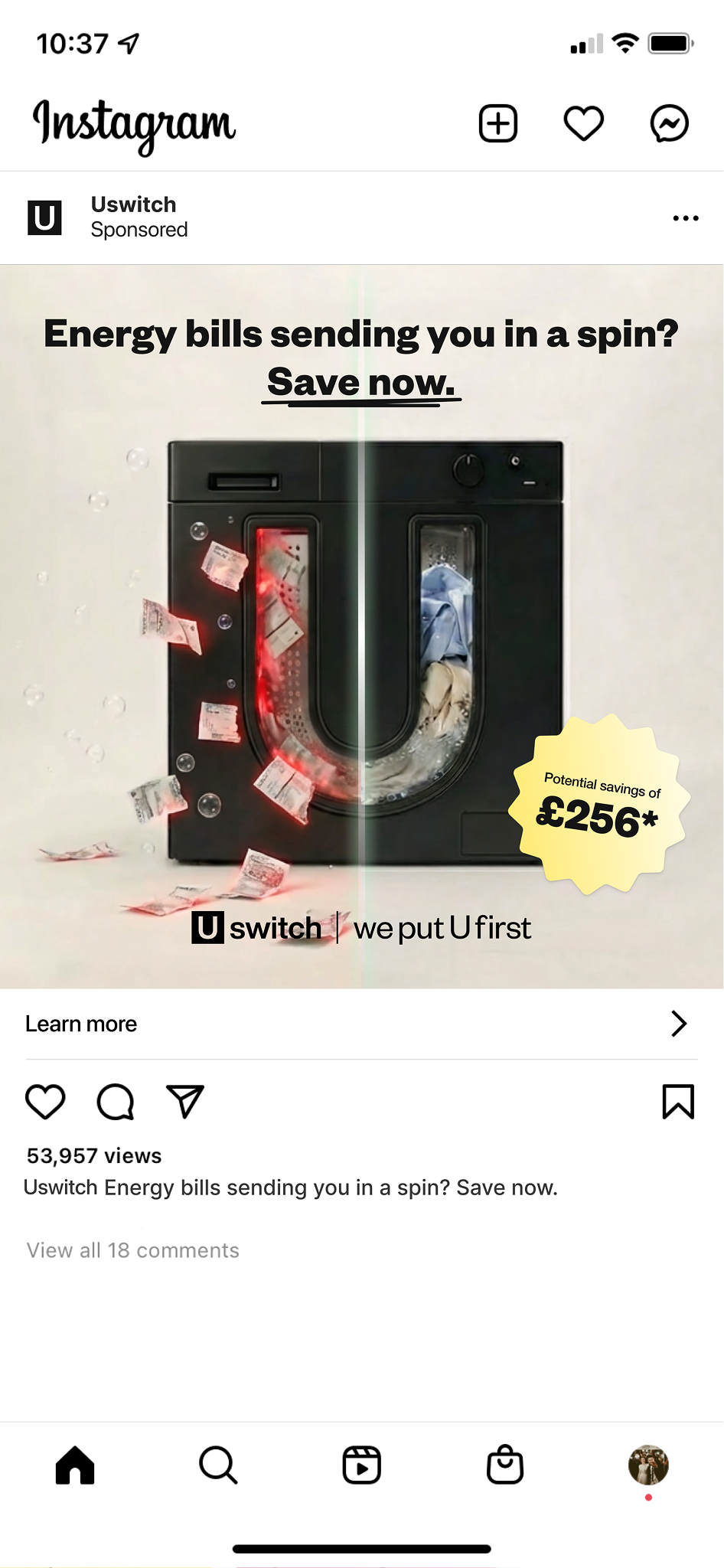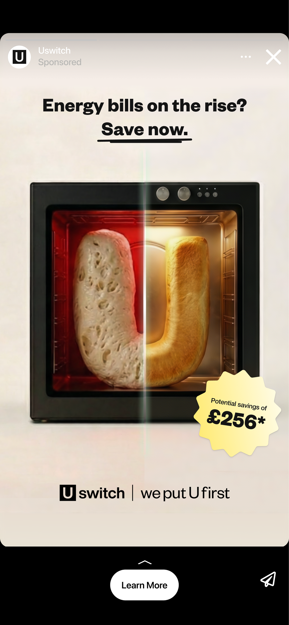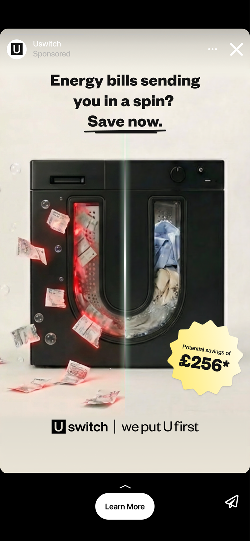 I explored how to visualise the emotional burden of high energy costs in a simple, relatable way. Household appliances were shaped into the Uswitch “U” logo, serving as a visual metaphor for everyday frustration with energy bills. For the video assets, ads followed a three-part storytelling structure, in line with Google’s ABCD (Attention, Branding, Connection, Direction) best practices: