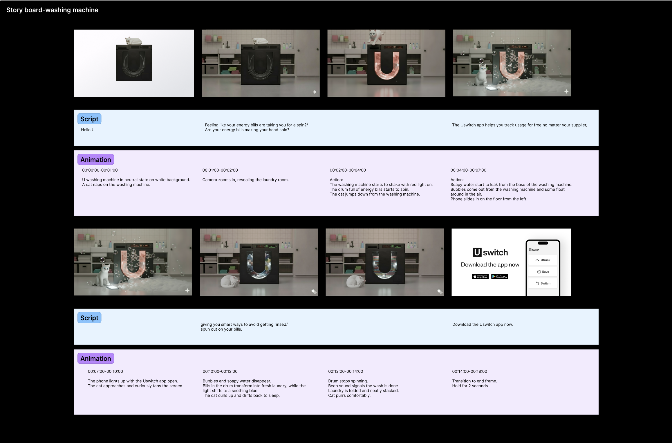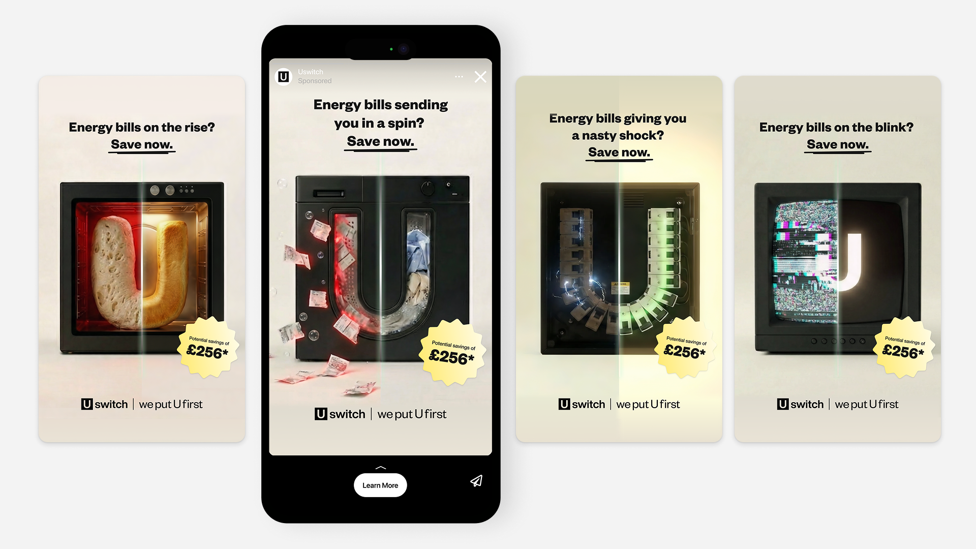 I explored how to visualise the emotional burden of high energy costs in a simple, relatable way. Household appliances were shaped into the Uswitch “U” logo, serving as a visual metaphor for everyday frustration with energy bills. Ads followed a three-part storytelling structure: